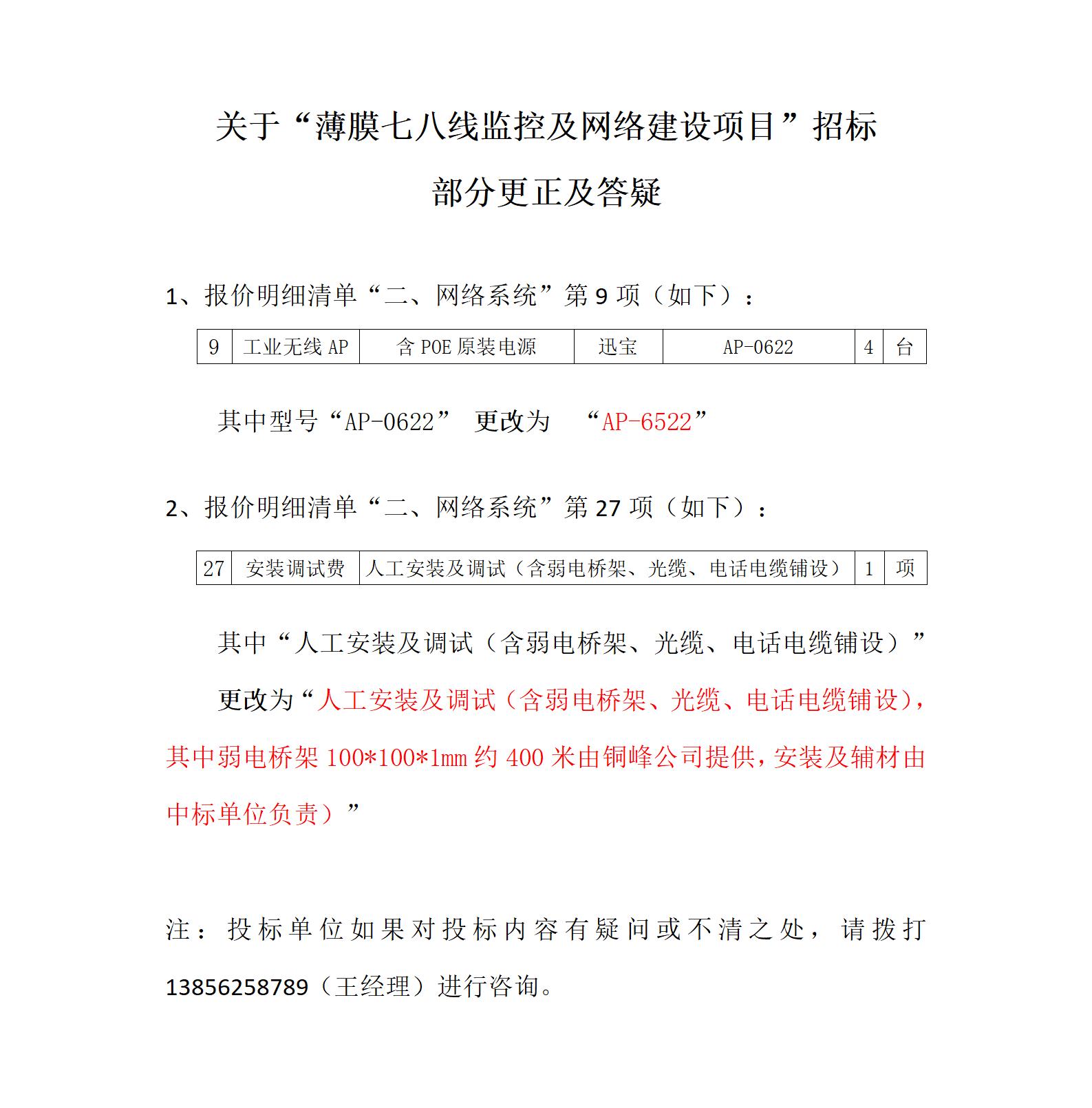 铜峰薄膜七八线监控及网络项目—招标清单更改及答疑