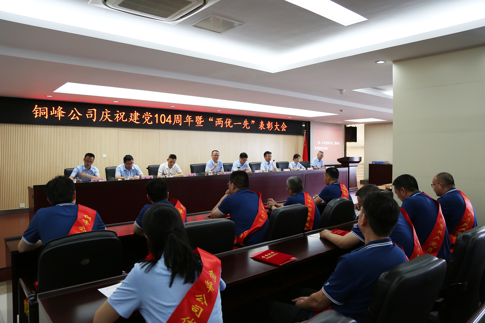 为热烈庆祝中国共产党成立104周年,表彰先进、树立榜样,激励广大党员干部职工在新征程上展现新作为,6月27日下午,公司在办公大楼二楼职教室隆重召开庆祝建党104周年暨“两优一先”表彰大会。公司党委书记、董事长黄明强出席大会并讲话,党委委员、总经理鲍俊华宣读表彰决定,党委副书记潘世宇主持会议并就贯彻落实会议精神作出部署。公司党委领导班子成员和公司级党员领导,纪委委员,各党(总)支部书记、委员,“两优一先”表彰对象、党员代表、新党员、入党积极分子代表等参加会议。