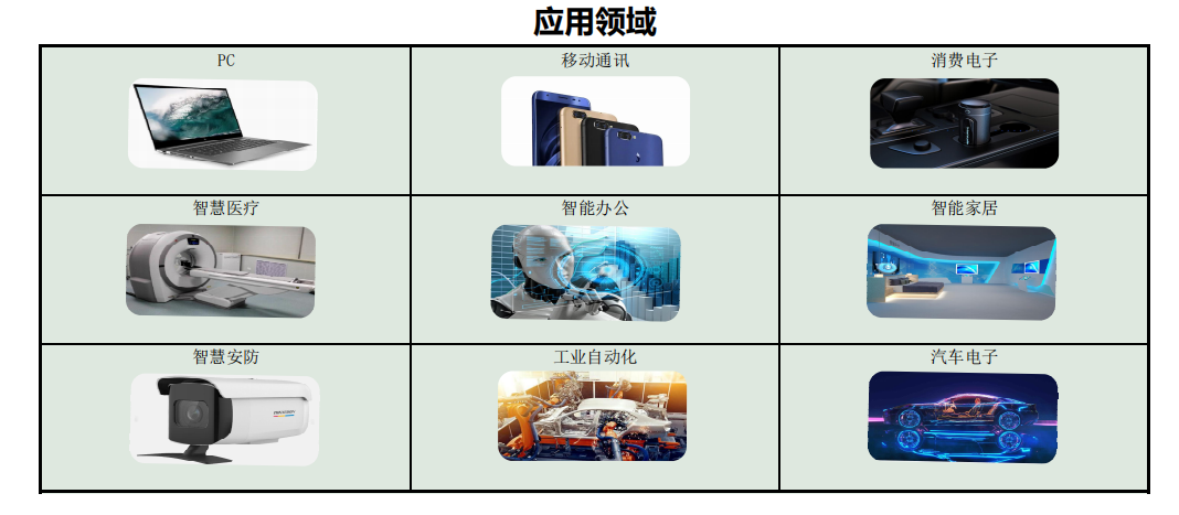产品广泛应用于:3C(计算机、通讯、消费电子)、智慧医疗、智能办公、智能家居、智慧安防、物联网、工业自动化及汽车电子等领域,灵活满足全球不同客户的差异化需求以及快速创新的追求。