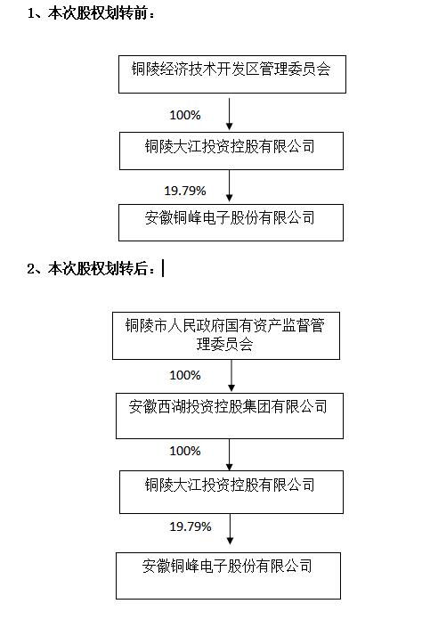截止目前,公司控股股东大江投资持有公司股份111,705,979股,占公司总股本的19.79%。本次股权划转完成后,公司控股股东未发生变化,仍为大江投资。本次股权划转完成后,公司间接控股股东为西湖投资,实际控制人由将由铜陵经开区管委会变更为铜陵市人民政府国有资产监督管理委员会。